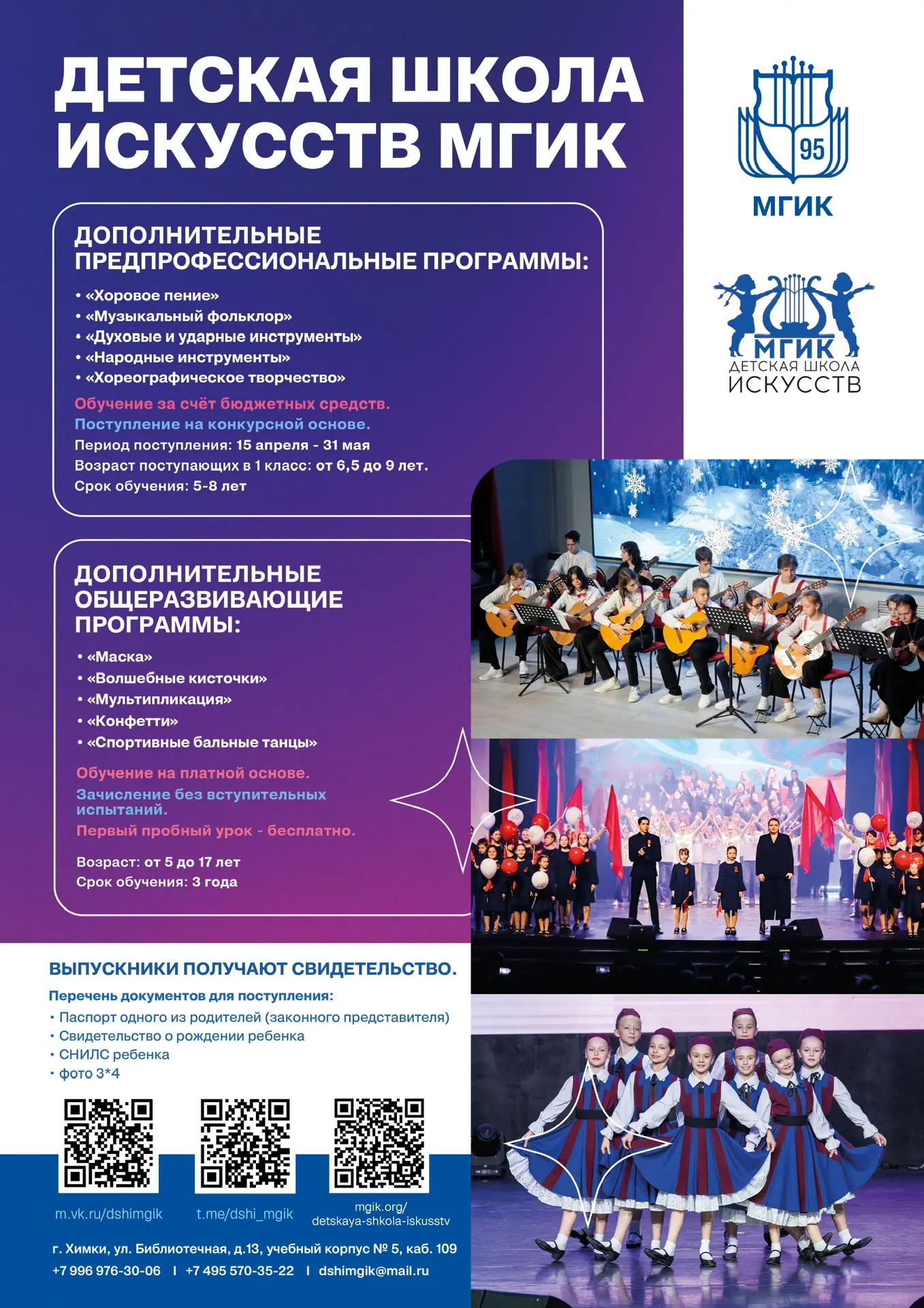 Учебные занятия проходят по адресу: г. Химки, ул. Библиотечная, д. 13, учебный корпус № 5, каб. 109. Получить дополнительную информацию можно по телефонам +7 (996) 976-30-06, +7 (495) 570-35-22 или по электронной почте dshimgik@mail.ru.