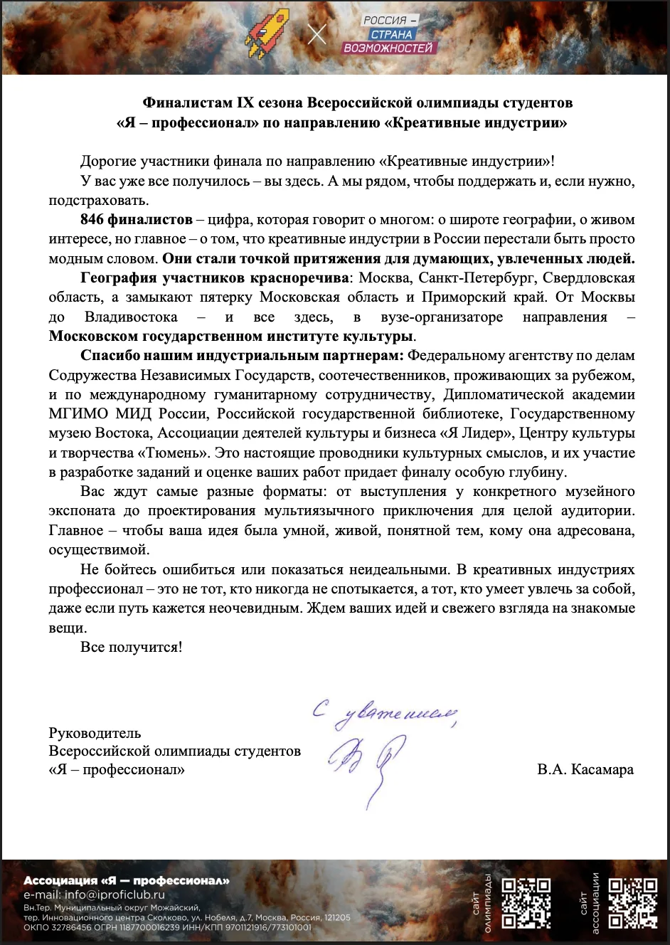 Спасибо нашим индустриальным партнерам: Федеральному агентству по делам Содружества Независимых Государств, соотечественников, проживающих за рубежом, и по международному гуманитарному сотрудничеству, Дипломатической академии МГИМО МИД России, Российской государственной библиотеке, Государственному музею Востока, Ассоциации деятелей культуры и бизнеса «Я Лидер», Центру культуры и творчества «Тюмень». Это настоящие проводники культурных смыслов, и их участие в разработке заданий и оценке ваших работ придает финалу особую глубину.