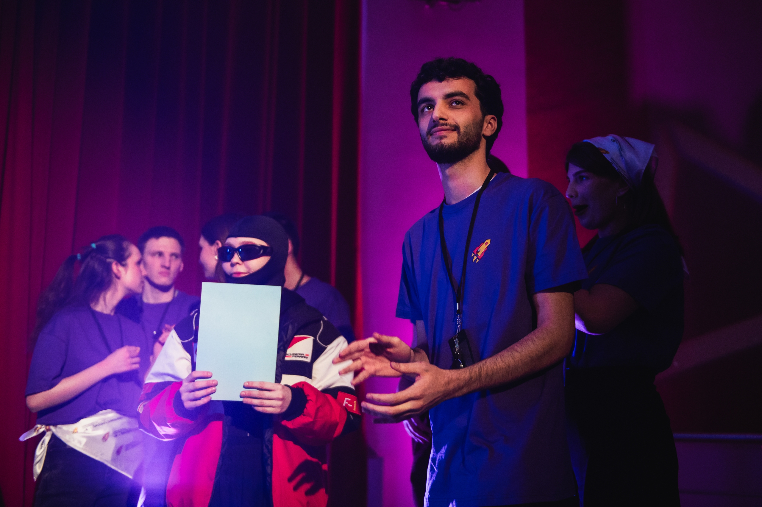 Ведущий представил членов жюри: председателя — заведующую кафедрой театрализованных представлений, кандидата педагогических наук, профессора, заслуженного деятеля искусств РФ Марину Викторовну Комарову, старшего преподавателя кафедры режиссуры театрализованных представлений Викторию Юрьевну Рахлинскую, доцента кафедры культурологии Никиту Владимировича Гришанина, директора Ассоциации, руководителя проекта «Я — Лидер» Илью Юрьевича Листопадова и заместителя начальника управления по воспитательной работе МГИМО (У) МИД России Наталью Николаевну Попову, победителя олимпиады 2025 года Алексея Юрьевича Михайлова.